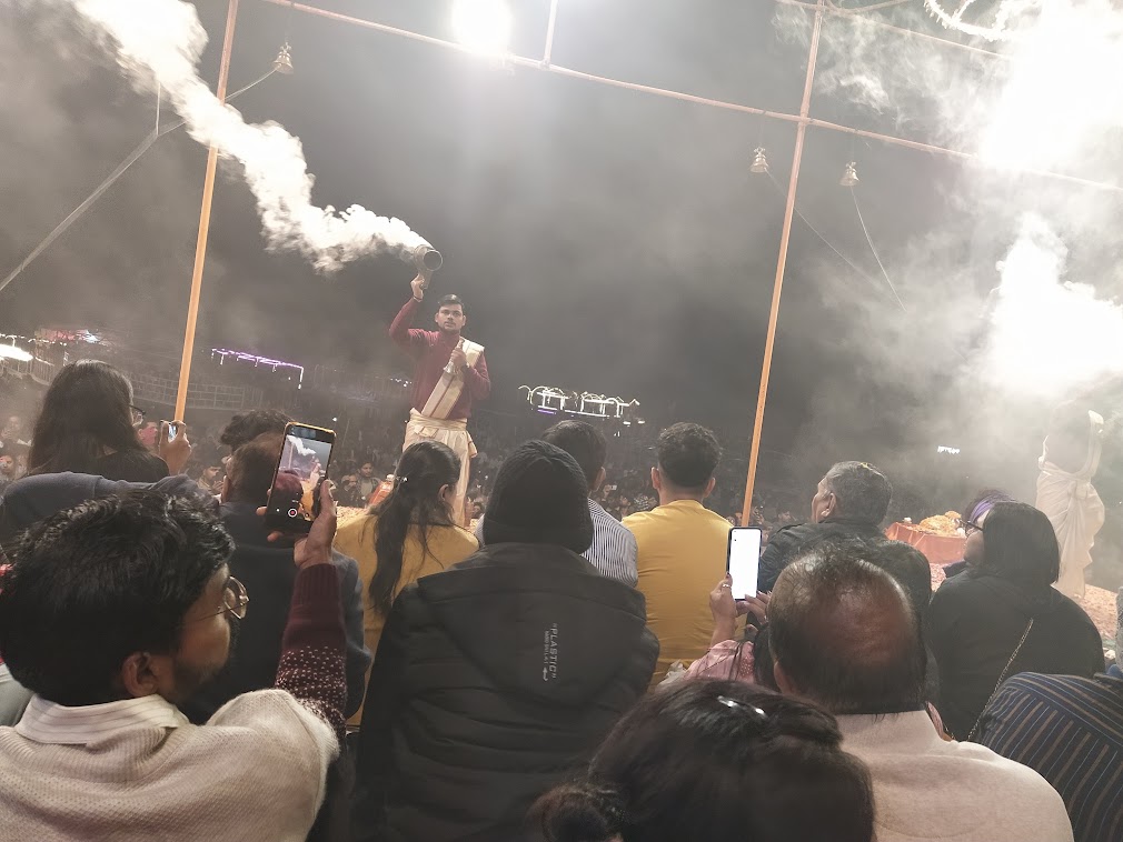 काफी समय इसके बाद मुझे अपनी साँसों को संयत करने में लगा, इसके बाद इत्तफाक से हमें ‘गंगा आरती स्थल’ पर एक चबूतरे पर बैठने का मौका मिल गया और हमने वाराणसी के इस दिव्य आकर्षण ‘गंगा आरती’ में श्रद्धा पूर्वक भाग लिया|